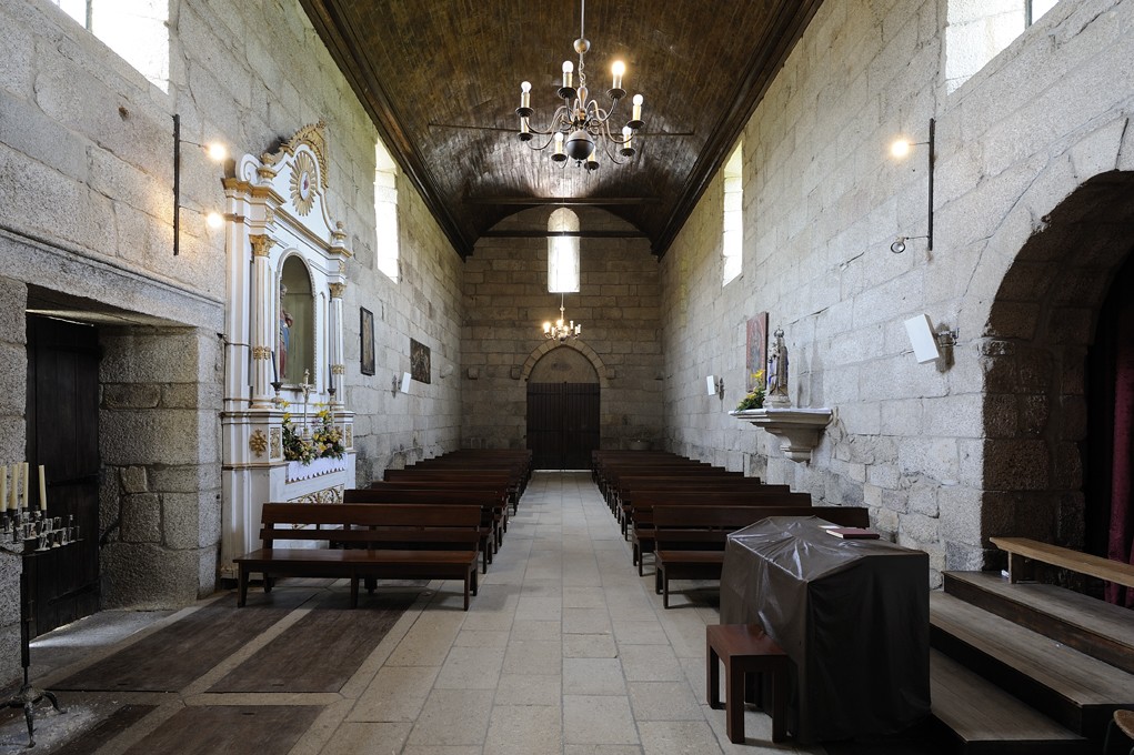 No interior, apenas o arco triunfal permanece como elemento remanescente da época românica, apesar de os seus capitéis se mostrarem hoje picados, pois a época moderna sobrepôs-lhes elementos entalhados que as intervenções de restauro do século XX removeram. As arquivoltas não têm qualquer decoração e a imposta é idêntica à do portal principal.